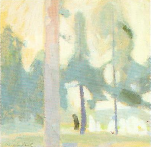 Schjerfbeck hatte schon vor 1900 Interesse an japanischer Kunst. Nach der Jahrhunderwende steigerte sich ihre Freude an der “japanischen Perspektive”. In der vorliegenden Komposition bezieht sich Schjerfbeck in der Platzierung des rosafarbenen Baumstammes direkt auf die dramatische Perspektivgebung japanischer Farbholzschnitte. Vor dem dunklen, grünen Wald zeichnen sich vage zwei Figuren ab. Rechts des Stammes stehen drei große, zart umrissene Bäume, die sich gegen den nordischen Abendhimmel abzeichnen.
